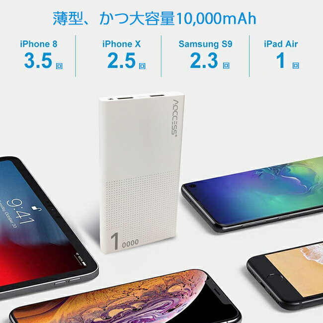 【特徴】 ・10000mAh超大容量モバイルバッテリー ・残量表示LEDライト搭載 ・USBポート×2で同時充電可 ・握りやすく滑りにくいデザイン 【仕 様】 USBポート数:2口 バッテリー:ポリマーリチウムイオン バッテリー容量:10000mAh 入力電圧/電流:DC5V/2A(最大) 出力電圧/電流:DC5V/1A、DC5V/2.1A 重 量:250g サイズ:L131×W70×H15mm 付属品:充電用マイクロUSBケーブル、取扱説明書 【PSE認証済】 安心のPSE認証取得済みモバイルバッテリー 【発送について】 こちらの商品はネコポスでの発送となります。