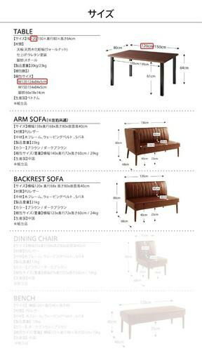 ■アームソファ (※左右共通サイズになります)【サイズ】横幅138x奥行68x高さ80x座面高40cm 【材質】PUレザー【中材】木フレーム、ウェービングベルト 、Sバネ【製品重量】25kg 【カラー】ブラウン / ダークブラウン【梱包サイズ/重量】横幅140x奥行72x高さ60cm / 29kg 【生産国】中国 ※組立品■バックレストソファ【サイズ】横幅120x奥行68x高さ80x座面高40cm 【材質】PUレザー【中材】木フレーム、ウェービングベルト 、Sバネ【製品重量】21kg 【カラー】ブラウン / ダークブラウン【梱包サイズ/重量】横幅123x奥行72x高さ60cm / 24kg 【生産国】中国※組立品■ダイニングテーブル(W120)【サイズ】 幅120 奥行80 高さ64cm【材質】 天板:天然木化粧板(ウォールナット) 仕上げ:ウレタン塗装 脚部:スチール【製品重量】20kg【梱包数】2【生産国】ベトナム※組立品■3点セットセット内容:ダイニングテーブル、アームソファ、バックレストソファ梱包数:4※1年保証付き。