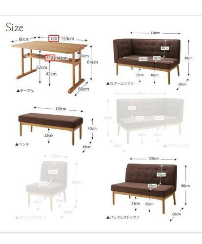 北欧デザイン リビングダイニングセット ■アームソファ (※左右共通サイズになります)【サイズ】(約)横幅138 x 奥行68 x 高さ80 x 座面高40cm 【材質】ポリエステル【中材】木フレーム、ウェービングベルト 、Sバネ【製品重量】(約)25kg 【カラー】ブラウン / ベージュ 【梱包サイズ/重量】(約)横幅140 x 奥行72 x 高さ60 cm / 29kg 【生産国】中国 ※組立品■バックレストソファ【サイズ】(約)横幅120 x 奥行68 x 高さ80 x 座面高40cm 【材質】ポリエステル【中材】木フレーム、ウェービングベルト 、Sバネ【製品重量】(約)21kg 【カラー】ブラウン / ベージュ【梱包サイズ/重量】(約)横幅123 x 奥行72 x 高さ60 cm / 24kg 【生産国】中国 ※組立品■ダイニング棚付きテーブル【サイズ】 W120:横幅120 奥行80 高さ64cm【材質】 天板:天然木化粧板(オーク) 仕上げ:ウレタン塗装 脚部:天然木(ラバーウッド)【梱包数】1【梱包サイズ】 W120:横幅130 x 奥行90 x 高さ12 cm 【生産国】ベトナム ※組立品■ベンチ【サイズ】(約)横幅120 x 奥行46 x 高さ40 x 座面高40cm 【材質】ポリエステル【中材】木フレーム、ウェービングベルト 、Sバネ【製品重量】(約)12kg 【カラー】ブラウン / ベージュ【梱包サイズ/重量】(約)横幅123 x 奥行48 x 高さ20 cm / 15kg 【生産国】中国 ※組立品■4点ベンチセット セット内容:ダイニングテーブル、アームソファ、バックレストソファ、ベンチ 梱包数:5※1年保証付き。