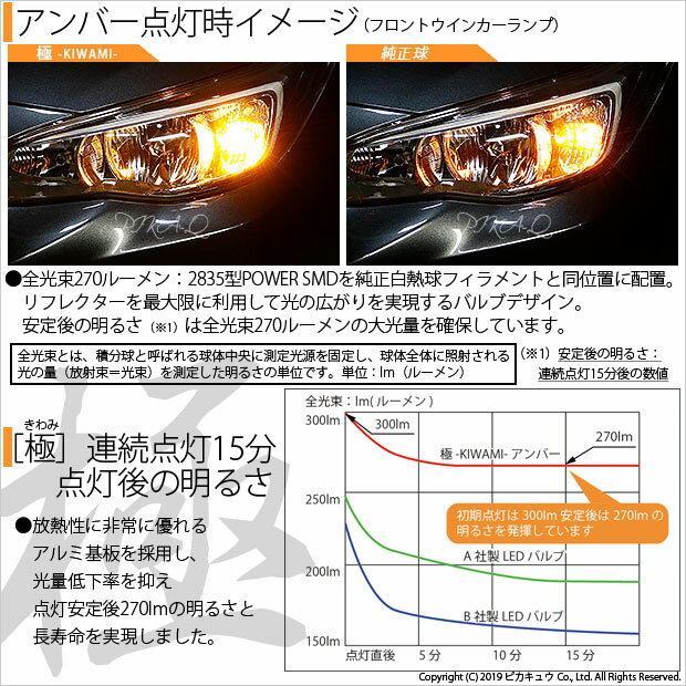 スバル XV [GT系](GT7/GT3/GTE)対応 ウインカーランプ用LEDバルブ (フロント・リア対応) T20シングル 極-KIWAMI-(きわみ)全光束270lm ウェッジシングル球 LEDカラー:アンバー 1セット2個入り 2835型POWER SMDを16個マウントしリフレクターを最大限に活かす強烈でワイドな照射光を可能にした「極-KIWAMI-」LEDバルブシリーズが新発売です。