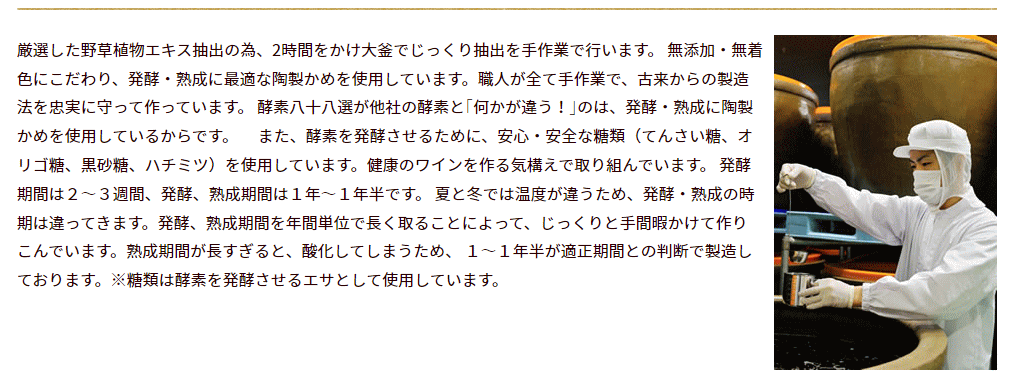 商品名 特選 酵素八十八選 内容量 720ml ×3個セット 原産国 日本(新潟越後) 全成分 【野草類】ヨモギ、ウコン、スギナ、ドクダミ、 ビワ葉、ラカンカ、キダチアロエ、クコの実、クコ葉、 ハト麦、オトギリソウ、クマザサ、タンポポの根、 レンセンソウ、モモの葉、エビスグサの種子、 イチョウ葉、レイシ、ニンドウ、イチジク葉、 ベニバナ、エゾウコギ、アマチャヅル、ハブ草、 トチュウ葉、エンメイ草、セッコツボク、 アカメガシワ、オオバコ、カンゾウ、マツ葉、 ナンテンの葉、カキの葉、高麗人参、カミツレ、 シソ葉、桑葉、アマドコロ、タマネギ外皮、 紅参、ツユクサ、メグスリの木、ツルナ、 ニーム、田七人参、キキョウ根、ナツメ、 プエラリアミリフィカ、マタタビ、マカ、 トンカットアリ、アガリクス、ルイボス、 アムラの実、キャッツクロー、紫ウコン、 ケツメイシ、センシンレン、ミカンの皮、 タラボクヒ、月桂樹、バジル、ディル、 キャッサバ、ローズマリー、セロリシード、 ローズヒップ、紫イペ、ザクロ花、黒ウコン、 アムラ、ビンカマイナー、松樹皮、アカガウクルア、 サラシア、竹、センナ茎、あすなろ葉、 オレンジピール、ギムネマ、サンザシ、 麻の実、ペパーミント、マリーゴールド、 パープルワイルドヤム、ジャスミンフラワー、 グァバ葉、ガラナ 【野菜類】大豆、トウガラシ、ニンジン、タマネギ、 パセリ、キャベツ、ゴボウ、モヤシ、ニンニク、 ショウガ、シイタケ、チャーガ、メシマコブ、トマト、ネギ 【果物類】イチジク、ミカン、キンカン、カリン、 パイナップル、ウメ、リンゴ、グレープ、メロン、 アンズ、レモン、グレープフルーツ、 オールスパイス果実 【海藻類】コンブ、フノリ 【MAP酵素】特許第2506307号 【糖類】てんさい糖、黒砂糖、オリゴ糖、ハチミツ 【ミネラル水:バナジウム160μg/L】 保存方法 直射日光と高温を避けて冷暗所で保存してください。