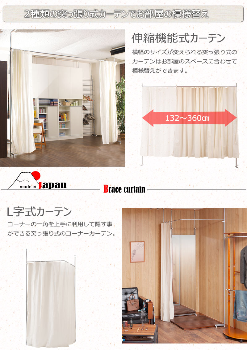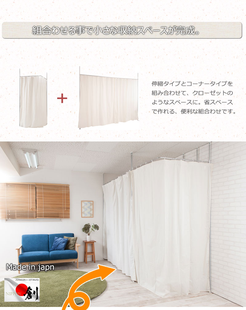 商品説明突っ張り式間仕切りカーテンにL型コーナータイプが新登場。